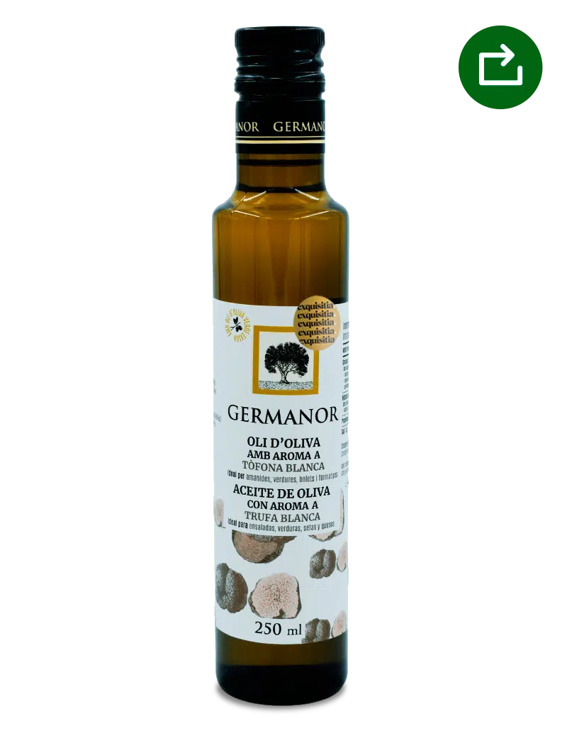 Descubre el Aceite de Oliva Virgen Extra Germanor Arbequina aromatizado con Trufa Blanca (Tuber Magnatum), un producto gourmet que une dos tesoros de la gastronomía mediterránea: el mejor aceite arbequino de Lleida y la trufa blanca, un aroma y sabor codiciado en todo el mundo.