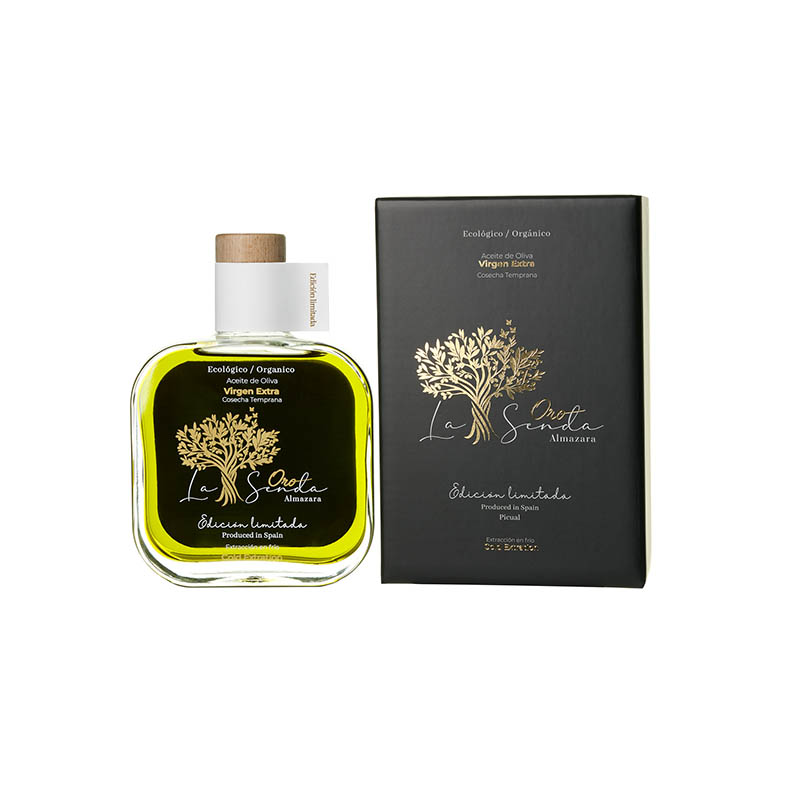 Este es un Aceite de Oliva Virgen Extra (AOVE), Ecológico y de Cosecha Temprana de Oro La Senda, pero de edición limitada, algo muy especial. Es de esos aceites con cuerpo., de color verde esmeralda y de producción ecológica certificada, con Denominación de Origen Campo de Montiel y con sello de calidad de Campo y Alma de Castilla La Mancha. Su presentación no puede ser más especial, una elegante botella de cristal oscuro de edición limitada donde guardar todas las sensaciones organolépticas y sensoriales. Un regalo con el que te dirán sí, ¡¡seguro!!